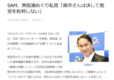 【速報】各芸能人が「戦争反対投票へ!」 一方でTRFのSAMさんは「高市総理は政策を語るのに、野党の候補者は何で悪口や罵詈雑言しか言わないの?」
