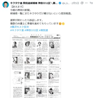 【速報】神奈川新聞さん、神奈川12区の候補者紹介紙面で藤沢モスク反対派候補者を掲載せず?候補者「選挙が終わったら訴訟します」