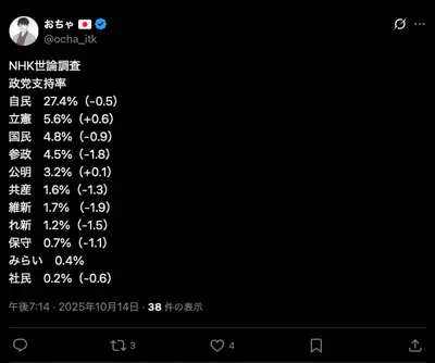【速報】支持率 自民党↓維新↓民主党↑ オールドメディアwww