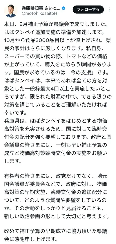 兵庫県斎藤知事、めちゃくちゃ仕事してた「県民の今日明日の家計を守るのが仕事だ」食品10月値上げの支援予算を爆速で可決