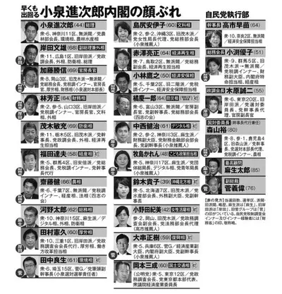 【速報】小泉内閣の顔ぶれ流れてきた模様「副総理兼外相・岸田/官房長官・加藤/財務・林/防衛・茂木/総務・河野/こども・牧島/幹事長・高市」