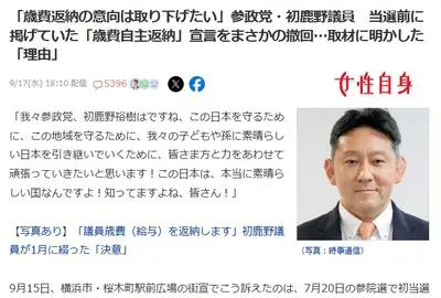 【参政党】初鹿野裕樹議員「やっぱり歳費返納の意向は取り下げたい」当選前に掲げていたマニフェストをまさかの撤回www