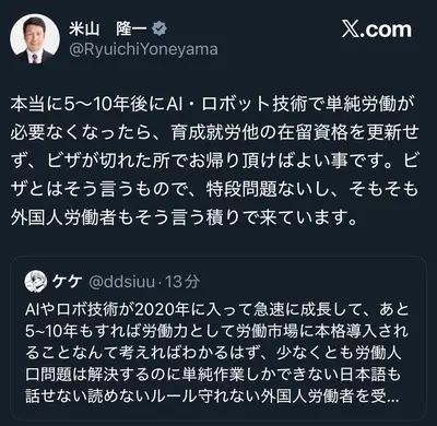 【悲報】米山隆一さん、「AIやロボットが発達して単純労働が無くなったら、在留資格を更新せず帰ってもらえばいい」