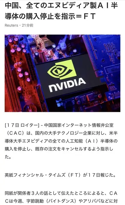 【速報】中国政府、すべてのNVIDIA製AI半導体の購入停止を指示 これもう戦争だろwww