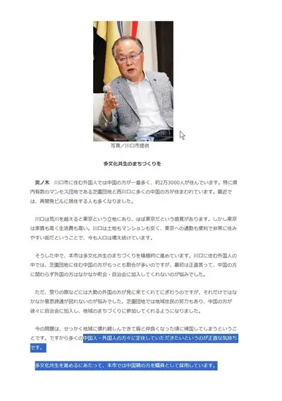【炎上】 さいたま・川口市長 「多くの中国人・外国人に定住していただく。中国人は職員として採用」昔から強い意志を持っていた模様
