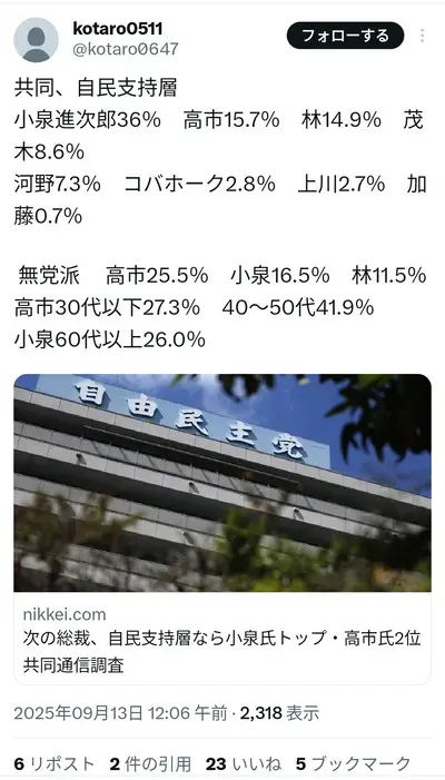 【最新】小泉36%、高市15.7%、林芳正14.9%、茂木8.6%、河野7.3%、コバホーク2.7%
