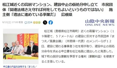 【悲報】松江城近くの高層マンション、建設中止の仮処分申し立てされる 市民団体「関連法規さえ守れば何をしてもよいというものではない」