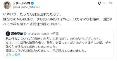 共産党・田村「NHK日曜討論、なんと高市首相が放送30分前にドタキャン!現場大騒ぎ」→代理の自民田村が説明「高市首相は遊説中に痛めて治療検査※関節リウマチ持ち」