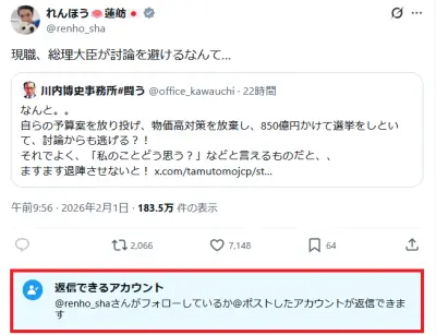【美しい職人芸】蓮舫さん、Xへの返信を制限しつつ「現職、総理大臣が討論を避けるなんて…」と呟きながらブーメランを投げ始める