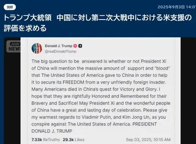 トランプ「中国はWW2時の支援を評価しろ」※なお支援対象は毛沢東(中国)ではなく蔣介石(台湾)