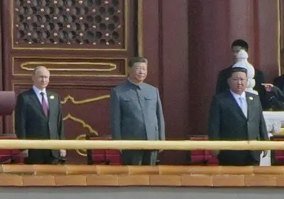 【画像】金正恩・習近平・プーチン、悪の枢軸三人衆が天安門の楼上に並ぶ※2列目にひょっこり日本の元総理大臣wwww