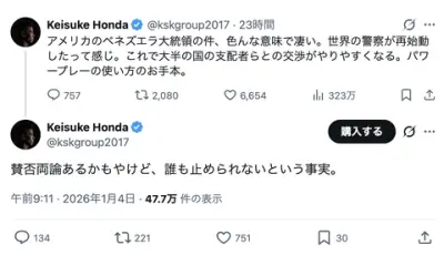 本田圭佑「アメリカのベネズエラ大統領拘束は色んな意味で凄い。世界の警察が再始動した。パワープレーの使い方のお手本」