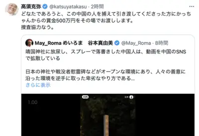 【速報】高須克哉さん、靖国神社に放尿した中国人に500万円の懸賞金をかけてしまう
