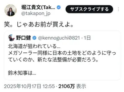 【炎上】野口健「北海道の土地が外国人に買い叩かれてる!」ホリエモン「じゃあお前が買えよ笑」
