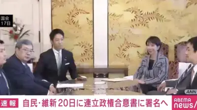 【速報】自民党と維新が20日に連立政権合意書に署名。高市総裁、日本初の女性総理へ