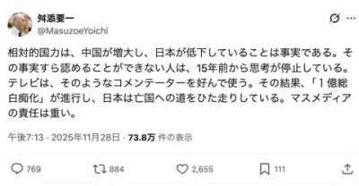 【正論】舛添要一「相対的国力は中国が増大し日本が低下している。その事実すら認めることができない人は、15年前から思考停止している」