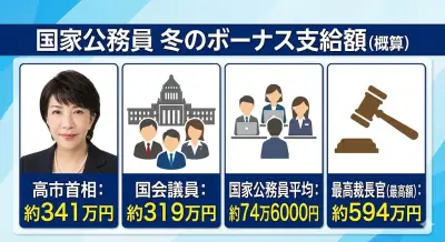 公務員に冬のボーナスが支給 → 平均約74万6,000円。高市首相は341万円、国会議員319万円、最高額は最高裁長官で594万円!