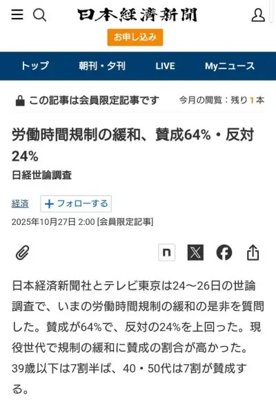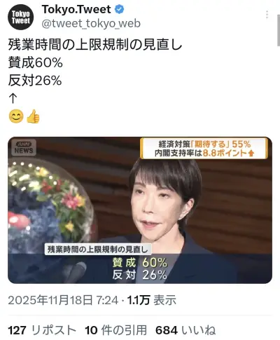 高市首相「労働時間規制に企業が過剰に反応した、本当はもっと働けるだろ」