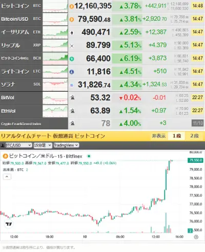 【相場】ビットコインさん、さらに値を伸ばし8万ドル目前に 過去最高値押し上げ中 トランプ氏期待