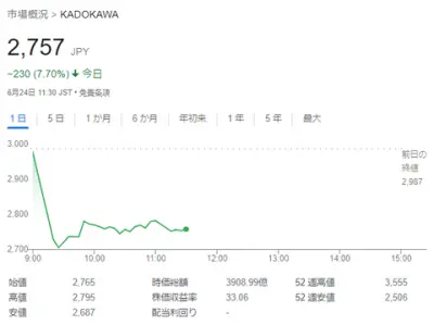 KADOKAWA株、本日も暴落(7%超マイナス) 交渉に関する一部報道を嫌気か