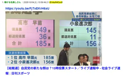 【Live映像あり】小泉氏vs高市氏で決戦投票へ