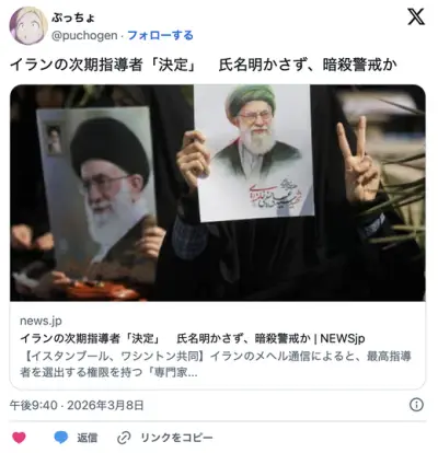 イランの次期指導者「決定」 氏名明かさず、暗殺警戒か