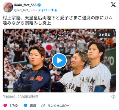【WBC】村上宗隆、天皇皇后両陛下退場時の“ガム噛み&腕組み”に批判の声「これはダメ」