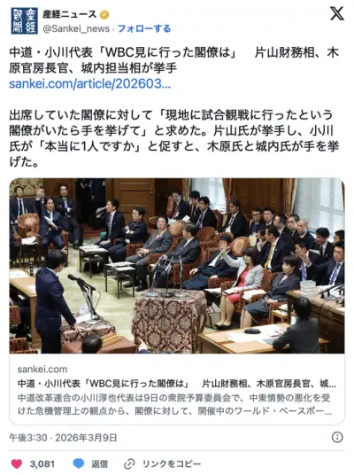 中道・小川代表「WBC見に行った閣僚は」 片山財務相、木原官房長官、城内担当相が挙手 🙋🙋♂🙋♂