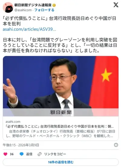 中国「台湾首相訪日!日本は必ず代償を支払う!」日本「政治無関係、プライベートなWBC観戦です」