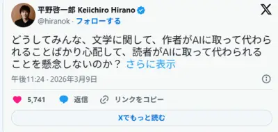 【作家】平野啓一郎「何故皆、文学に関して、作者がAIに代わられる事を心配して、読者がAIに取って代わられることを懸念しないのか?」
