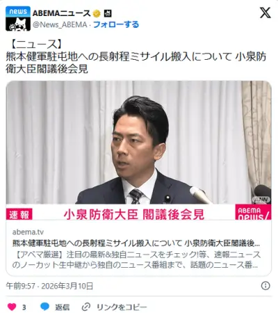 長射程ミサイル搬入 熊本県知事「何の知らせもない」に小泉大臣「明かせないことがある」 健軍駐屯地配備めぐり理解求める