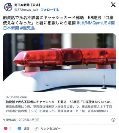 58歳派遣社員「融資してくれる人にキャッシュカード郵送したら口座が使えなくなったんだけど」→逮捕