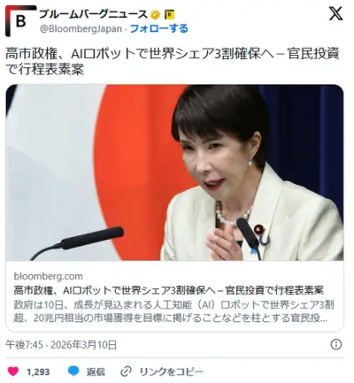 高市政権、AIロボットで世界シェア3割確保へ-官民投資で行程表素案