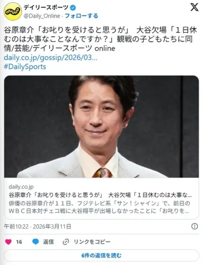 【WBC】谷原章介「お叱りを受けると思うが」 大谷欠場に「1日休むのは大事なことなんですか?」観戦の子どもたちに同情