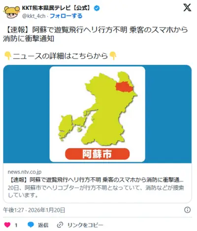 阿蘇で遊覧飛行ヘリ行方不明 乗客のスマホから消防に衝撃通知