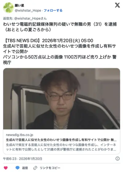 生成AIで実在するアイドルや女優などの芸能人に似せたわいせつな画像を作成しネットで公開していた無職の31歳男を逮捕