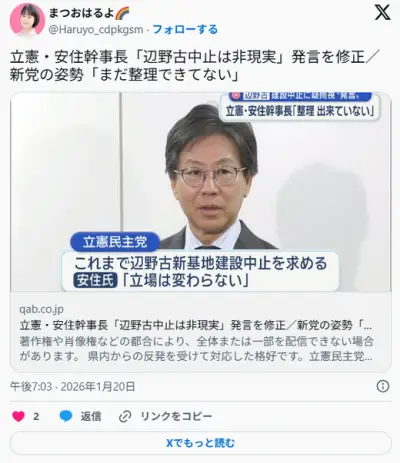 立憲・安住幹事長「辺野古移設中止は非現実的」→「まだ整理ができてない」とひよって修正