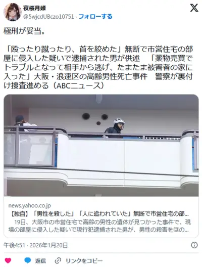 【大阪】「殴ったり蹴ったり首を絞めた」市営住宅に侵入した男「薬物売買のトラブルで、たまたま被害者の家に」浪速区の高齢男性死亡事件