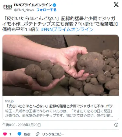 「皮むいたらほとんどない」記録的猛暑と少雨でジャガイモ不作…ポテトチップスにも異変?小型化で廃棄増加 価格も平年1.5倍に