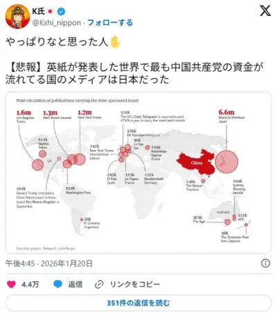 【悲報】世界で最も中国共産党の資金が流れてる国のメディアは日本だった