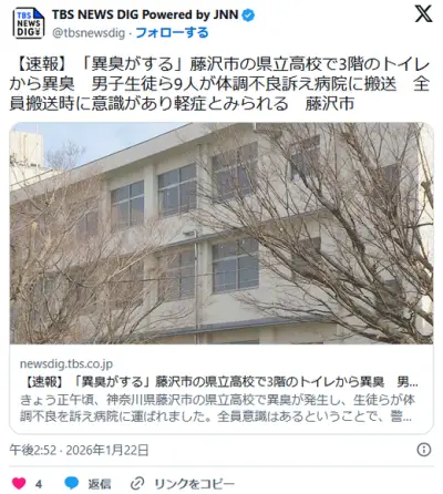 【速報】「異臭がする」藤沢市の県立高校で3階のトイレから異臭 男子生徒ら9人が体調不良訴え病院に搬送 全員搬送時に意識あり軽症