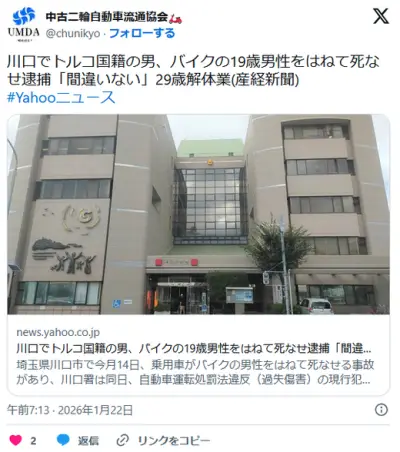 川口でトルコ国籍の男、バイクの19歳男性をはねて死なせ逮捕「間違いない」29歳解体業