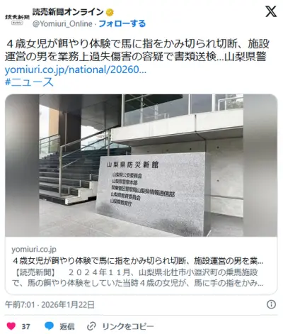4歳女児が餌やり体験で馬に指をかみ切られ切断、施設運営の男を業務上過失傷害の容疑で書類送検…山梨