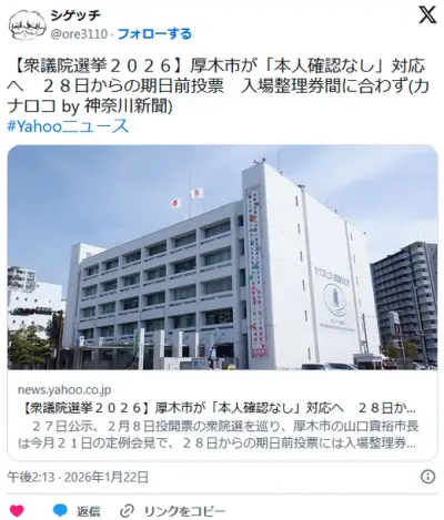 【悲報】厚木市「投票券郵送が間に合わないので本人確認しません!」日本の選挙終わる
