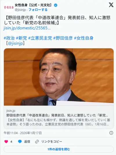 【中道】野田佳彦氏、新党に「自民党議員で誰が入りそうですか?」と質問され回答「複数というか結構…」