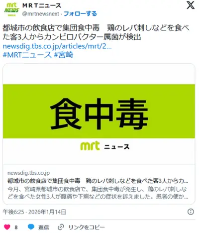 【宮崎】飲食店でカンピロバクター食中毒 3人に症状 鶏のレバ刺しなどを食べたという
