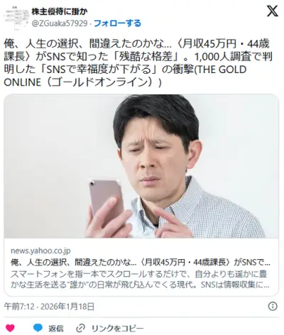 俺、人生の選択、間違えたのかな…〈月収45万円・44歳課長〉がSNSで知った「残酷な格差」「SNSで幸福度が下がる」