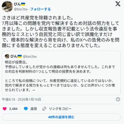 日本共産党、政治資金報告書不記載を告発した党員を除籍
