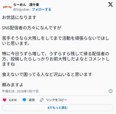 人気ラーメン店、かなりの量を残した配信者に注意「“お前大残しだよな”とコメントしますね」「食えないで困ってる人など沢山いる」