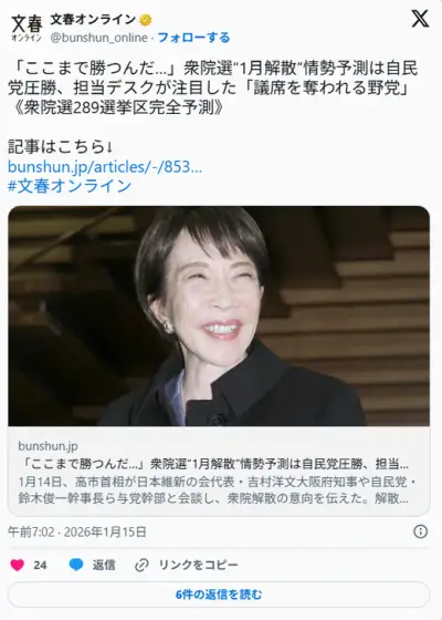 週刊文春予測2026衆院選 情勢予測は 高市早苗圧勝 中道連合は爆散 国民民主が野党第1党か
